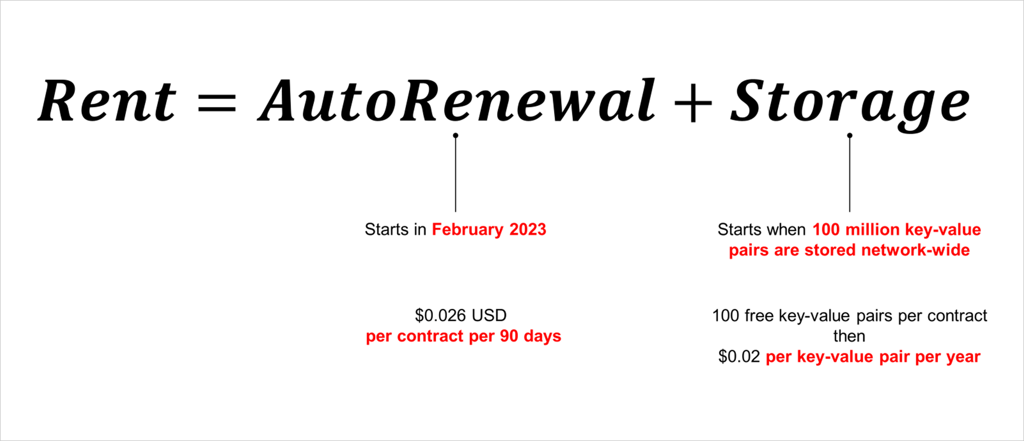• Storage payments will start once a total of 100 million key-value pairs are stored cumulatively across the network. These storage fees will be part of the rent payment collected when a contract is auto-renewed. The storage fee rate is $0.02 per key-value pair per year.