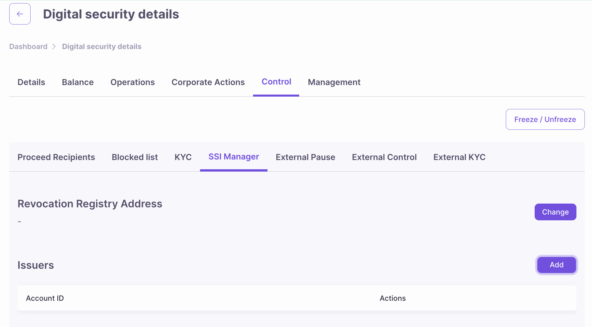 What is an SSI Manager/Issuer? The SSI Manager manages the list of trusted issuers * entities authorized to sign Verifiable Credentials (VCs) that your token will accept for KYC purposes. Think of it like a whitelist of “trusted KYC providers.”- SSI Manager Role (