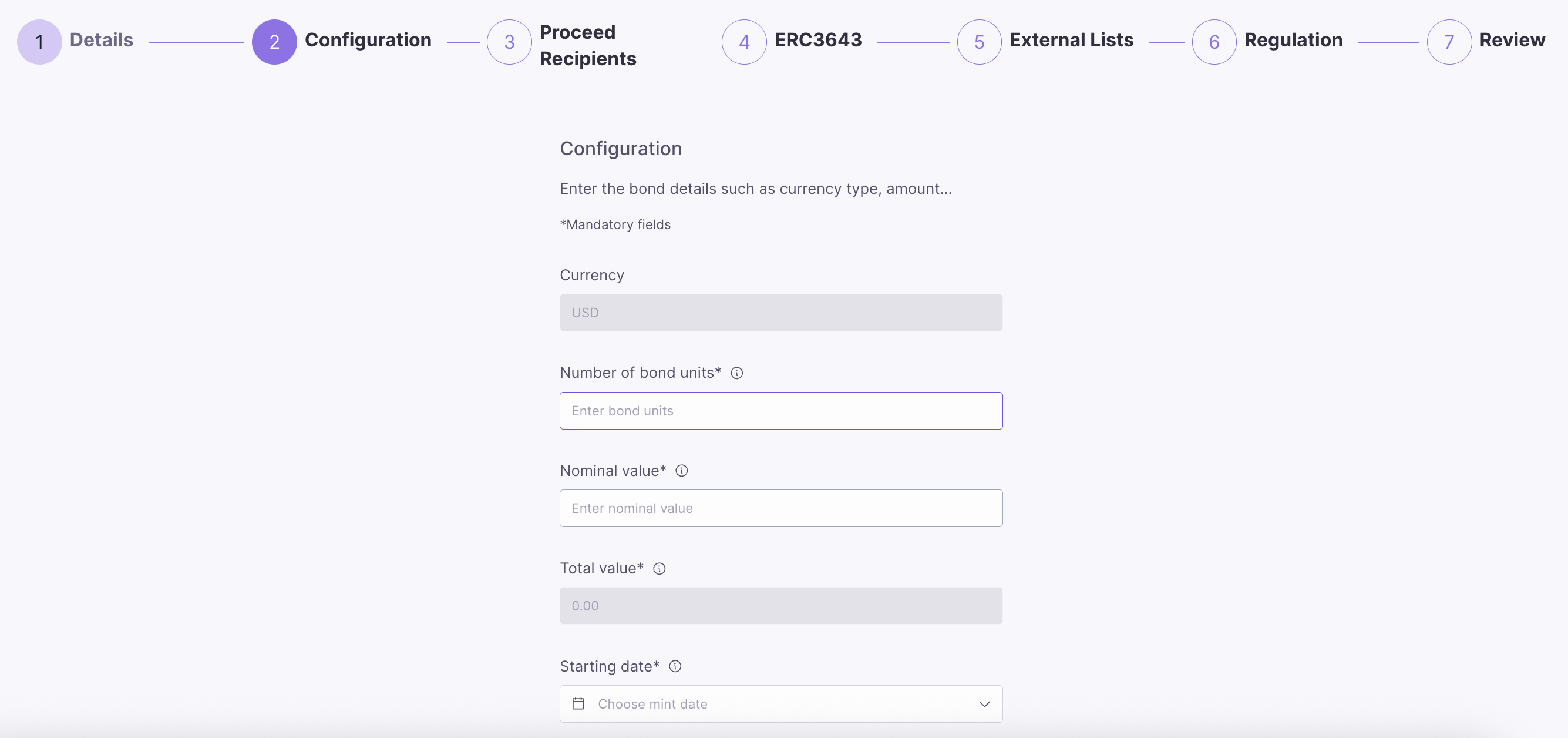 Enter the bond details, such as the nominal value, number of bond units, starting (mint) date, and maturity date.- Number of Bond Units: The total number of bond tokens to be issued. Each unit represents a fraction of the overall bond and can be bought, sold, or transferred.
