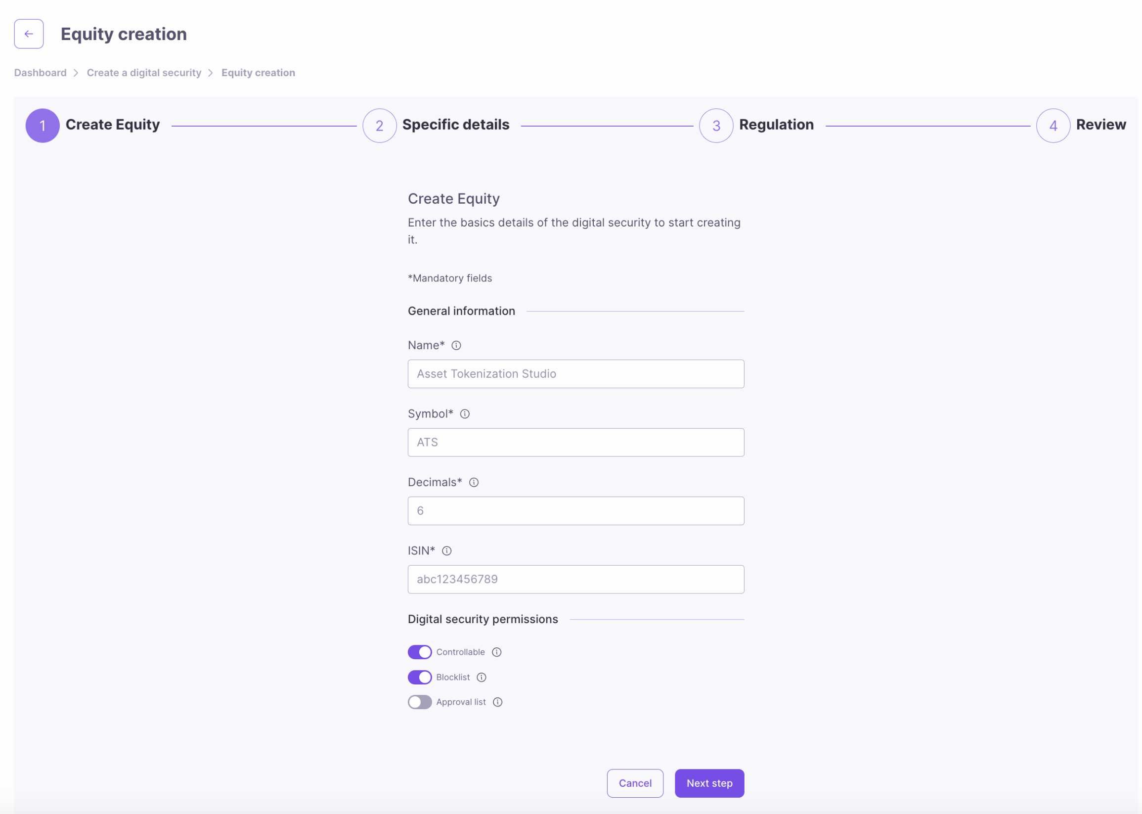 Toggle the permissions you want to enable for your new equity:- Controllable: Enables token controller role and compliance operations.