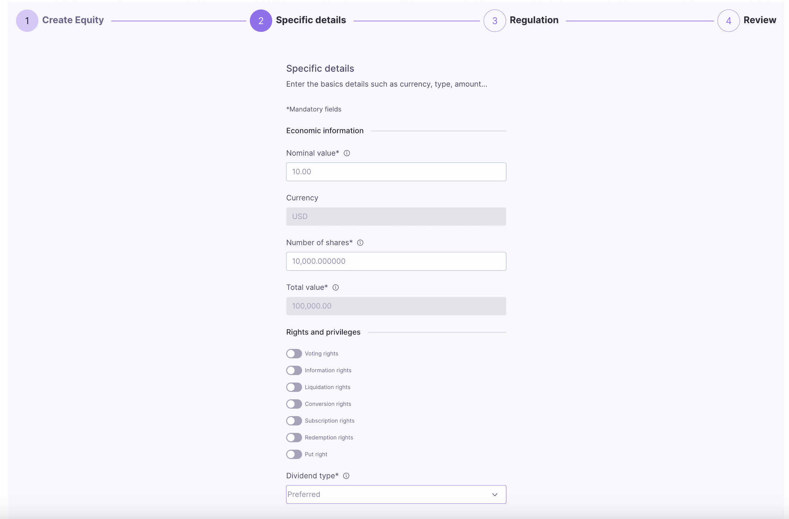 Enter the specific details of the new equity, such as nominal value and number of shares, and select the applicable rights and privileges each token will hold.- Nominal Value: Value of each equity token in the selected currency.