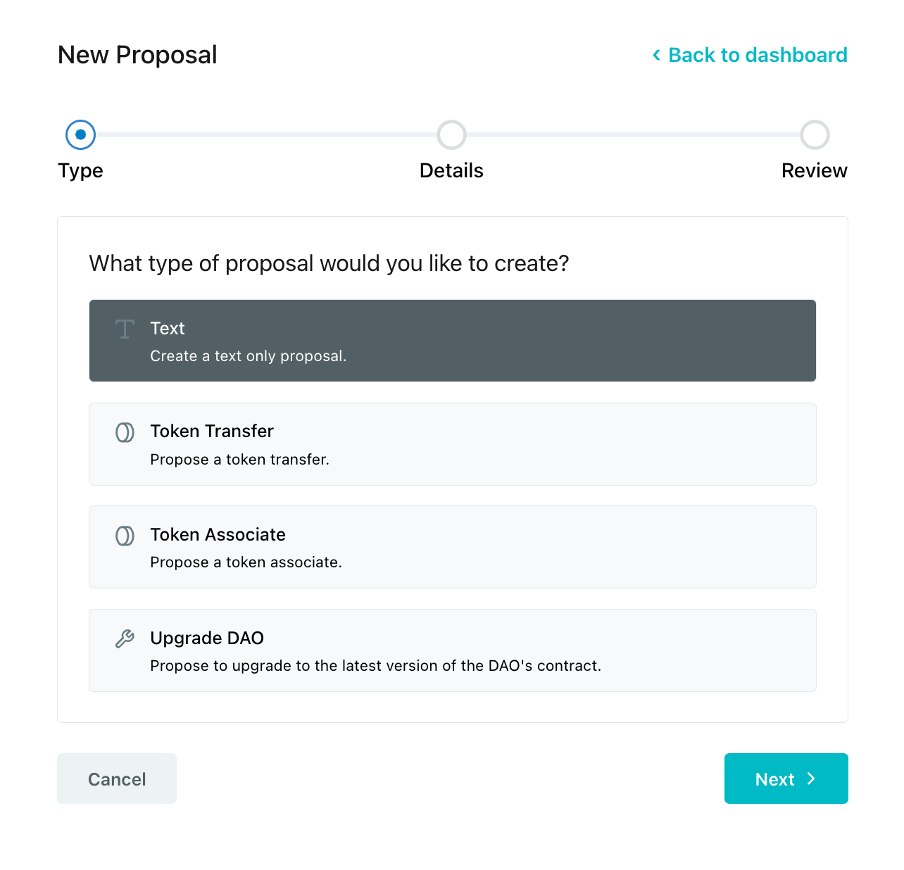 From the HashioDAO dashboard, click on the DAO you created in the previous step to manage the DAO and create new proposals. Click New Proposal and let’s review the different types of proposals and examples. You can create a proposal for various activities like a text, token transfer, token associate, and upgrade DAO proposal.