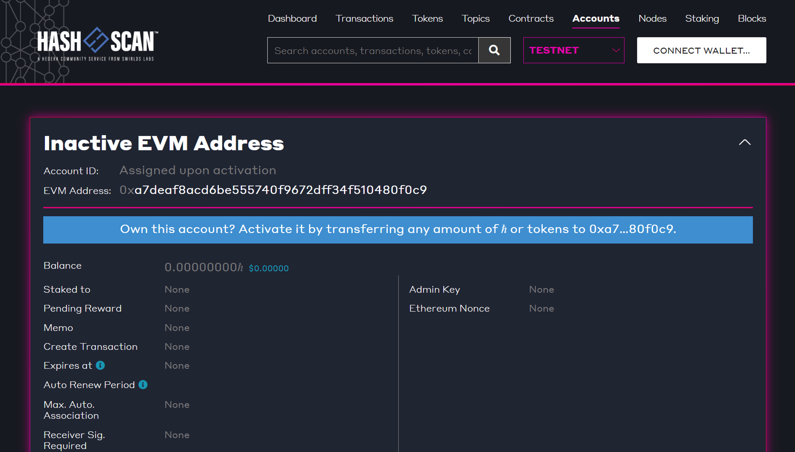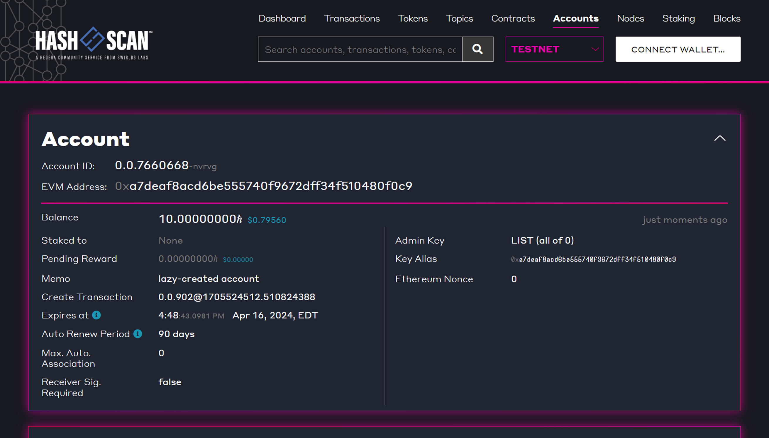 Once the network switches and the account is paired, you should see something like the following in the dApp UI and in HashScan (if you click on the hyperlinked text showing the account address).