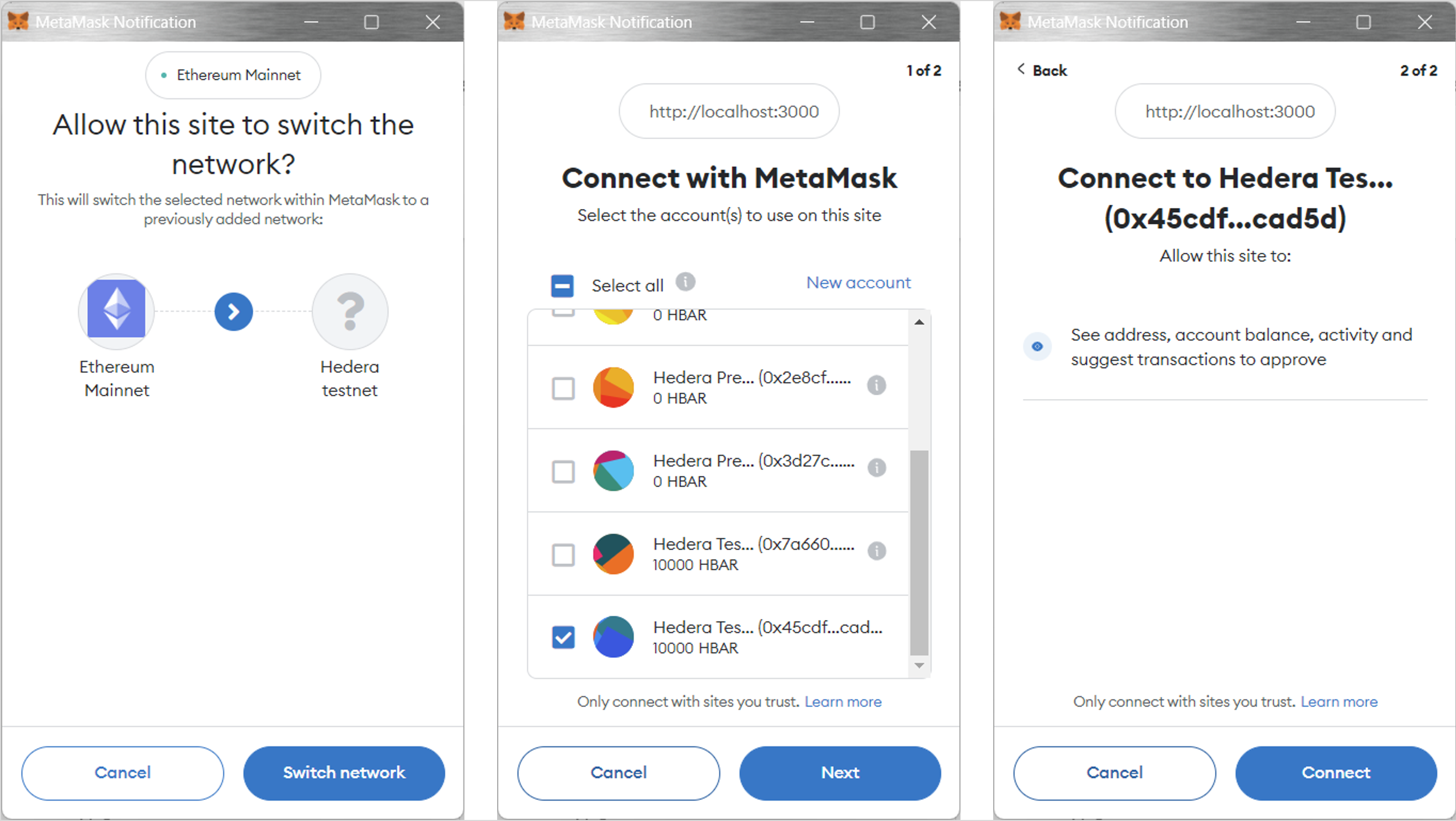 2. Switches to Hedera Testnet: It determines the chainId based on the chosen Hedera network (testnet, previewnet, or mainnet) and sends a wallet_addEthereumChain request to MetaMask to add the corresponding Hedera network. A chain ID is a unique identifier that represents a blockchain network. This is an important step that includes setting the native currency (HBAR) and providing the JSON-RPC and network explorer URLs. For the JSON-RPC provider, this example uses Hashio, a community-hosted JSON-RPC relay provided by Hashgraph (note that anyone can host their own relay and/or use other commercial providers, like Arkhia). For network explorer, HashScan is used. (Keep in mind that HashScan supports EIP-3091, which makes it easy to explore historical data like blocks, transactions, accounts, contracts, and tokens from wallets like MetaMask).