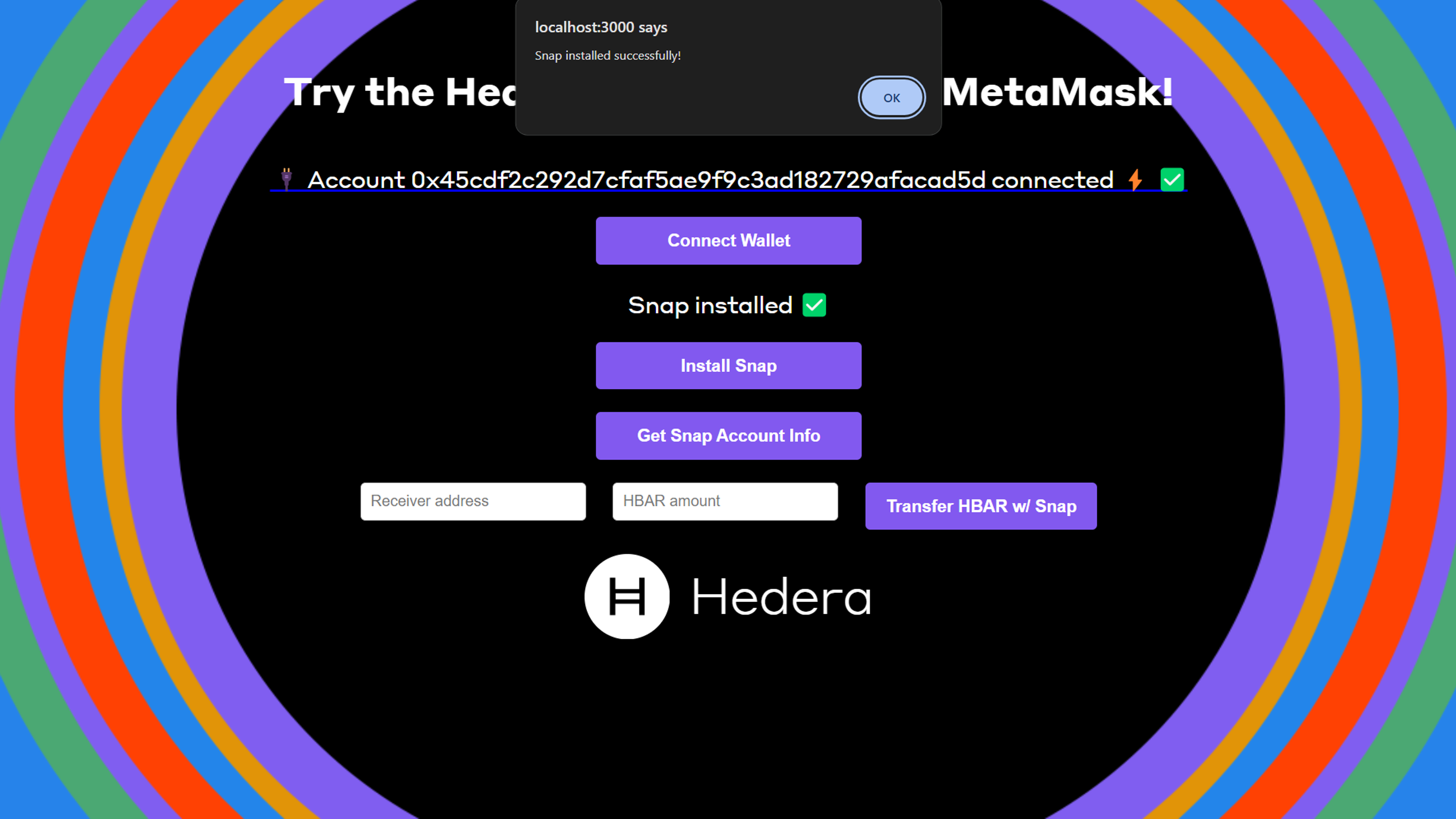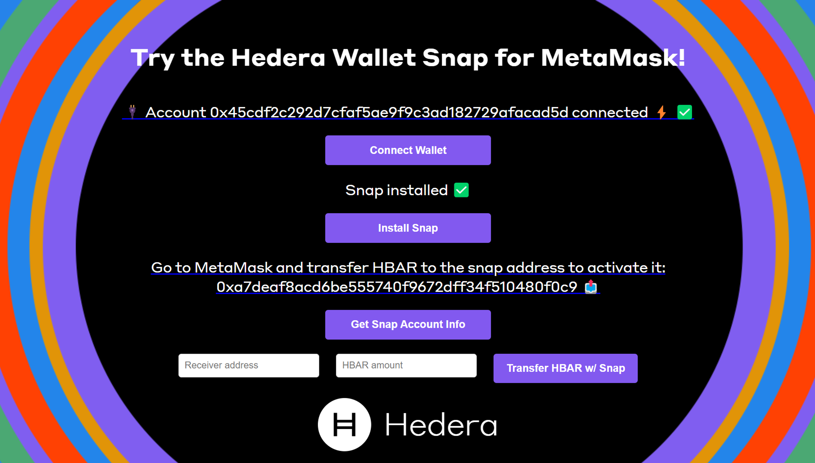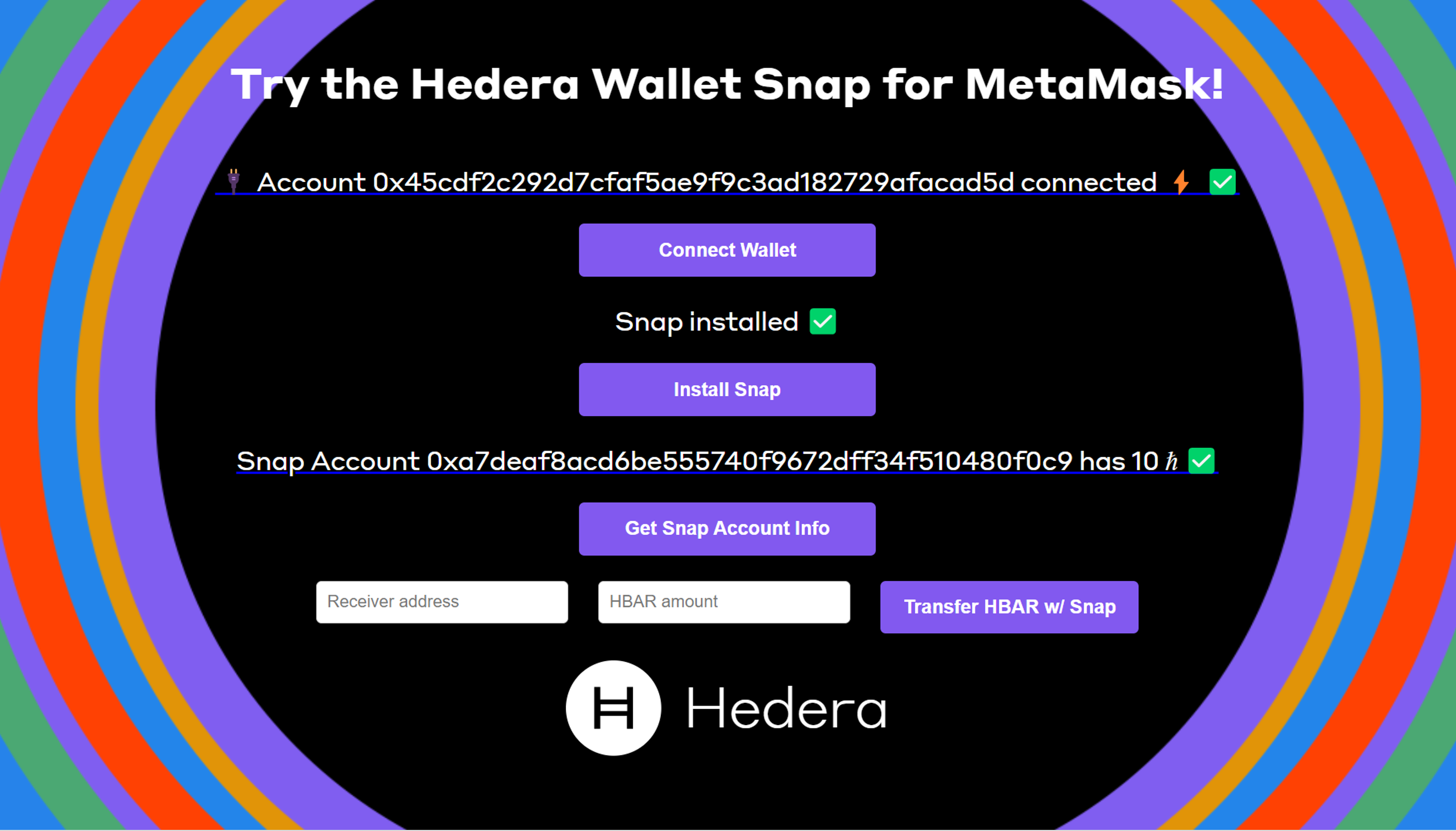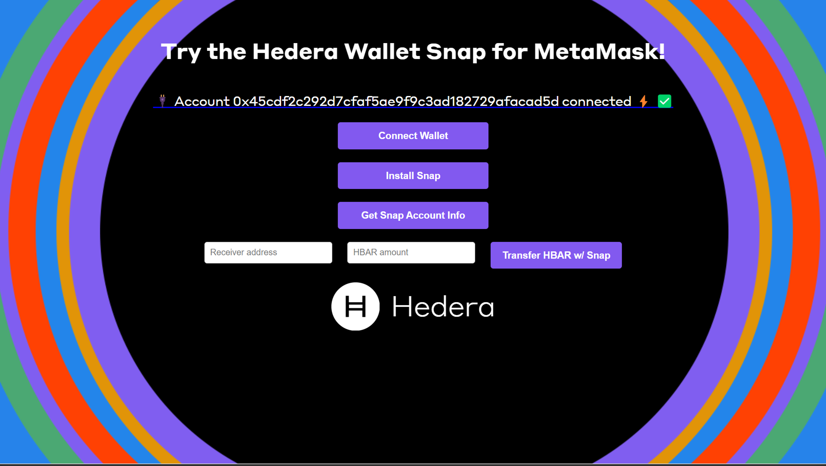 🎉 Congratulations! You have learned about the new Hedera Wallet Snap by MetaMask and how to integrate it into a dApp. Feel free to reach out in Discord if you have any questions!