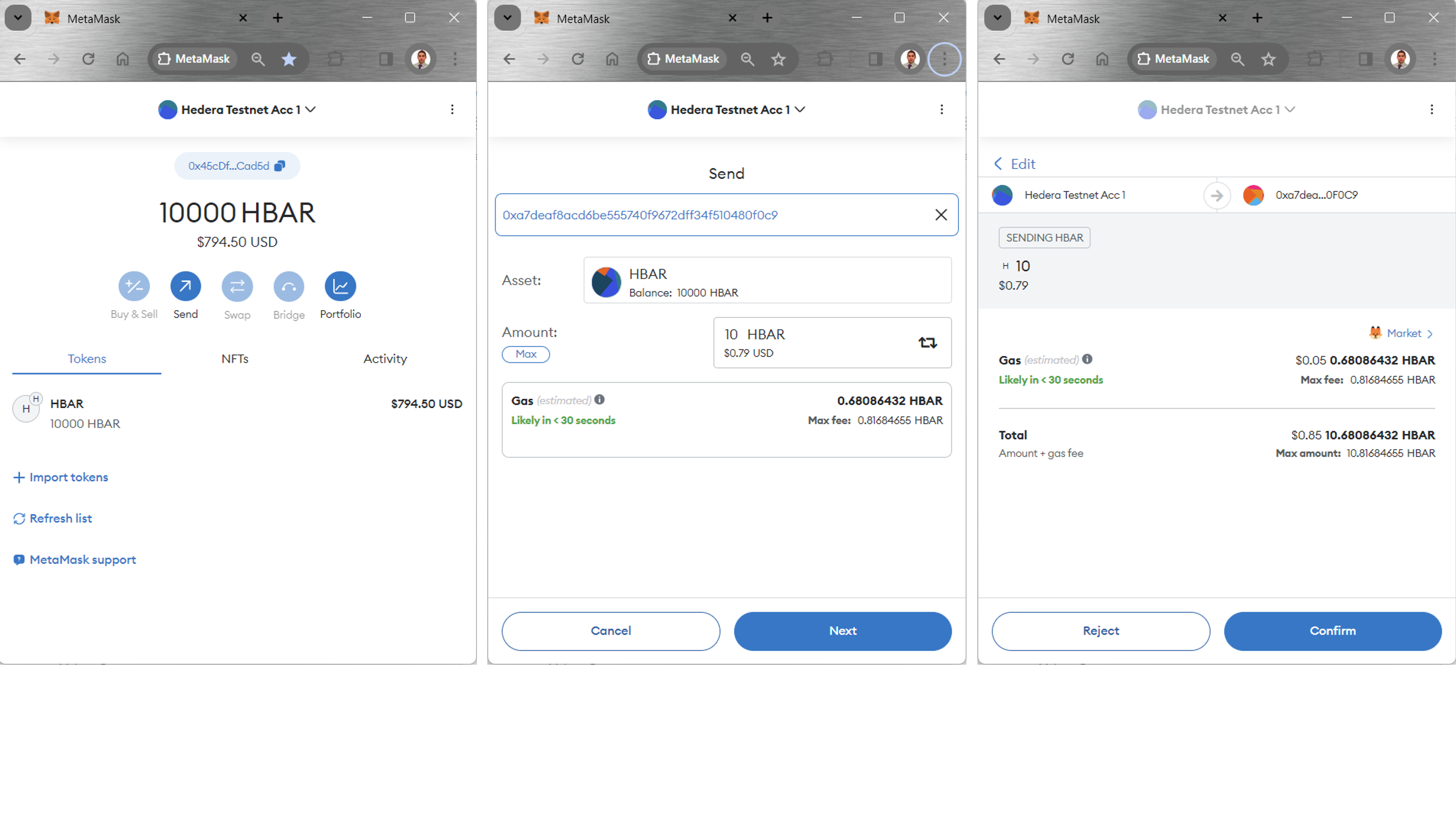 We now know the EVM address for the Snap account. However, this Snap account has not yet been created on the Hedera network (testnet in this case). It’s time to send HBAR to that address to create the actual Hedera account for the snap. Perform a transfer of 10 HBAR to the Snap address. In this case, the Snap address is: 0xa7deaf8acd6be555740f9672dff34f510480f0c9
