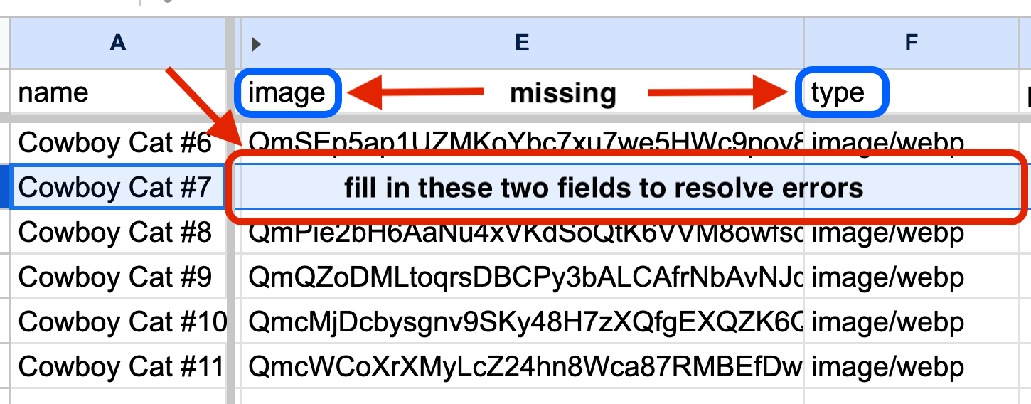 Before proceeding with your NFTs, ensure all required fields are present and meet the HIP-412 standards. Open the CSV file, update the missing “type” and “image” fields, and save the file. Upload your updated metadata file to the validator tool to confirm that the errors have been resolved.