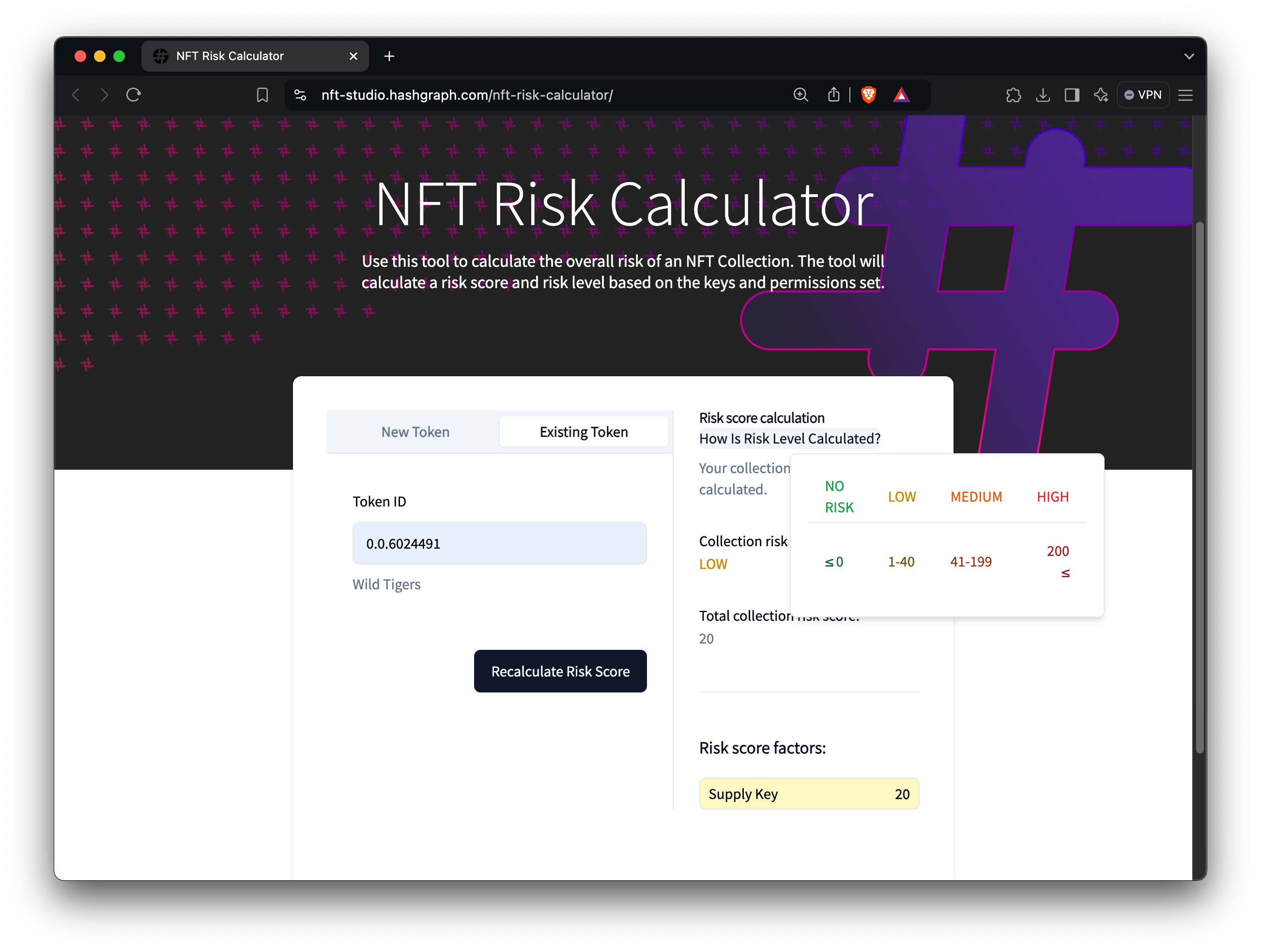 The NFT Risk Calculator evaluates the potential risk associated with tokens on the Hedera network, focusing on the likelihood of a “rug pull” based on specific token properties. The risk calculator generates a comprehensive risk score and risk level by analyzing key factors, such as the Admin Key, Supply Key, and KYC Key. The calculator can be used to assess both existing tokens and those you plan to create, gaining insights into how specific properties may make a collection more or less risky. This helps developers and token creators make informed decisions about token security and governance.