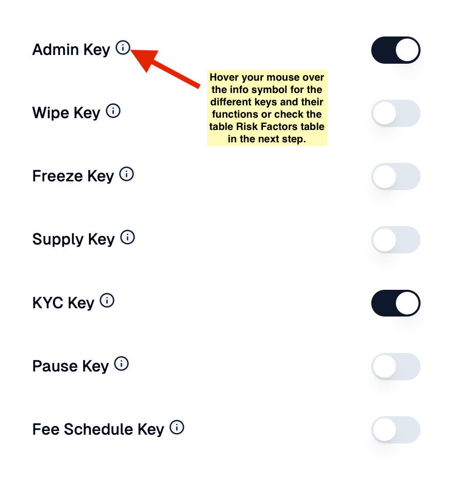 • KYC Keys determine whether accounts need to be verified (KYC’d) before transacting with the token. A token requiring KYC may indicate stricter control and lower risk but also restricts participation.