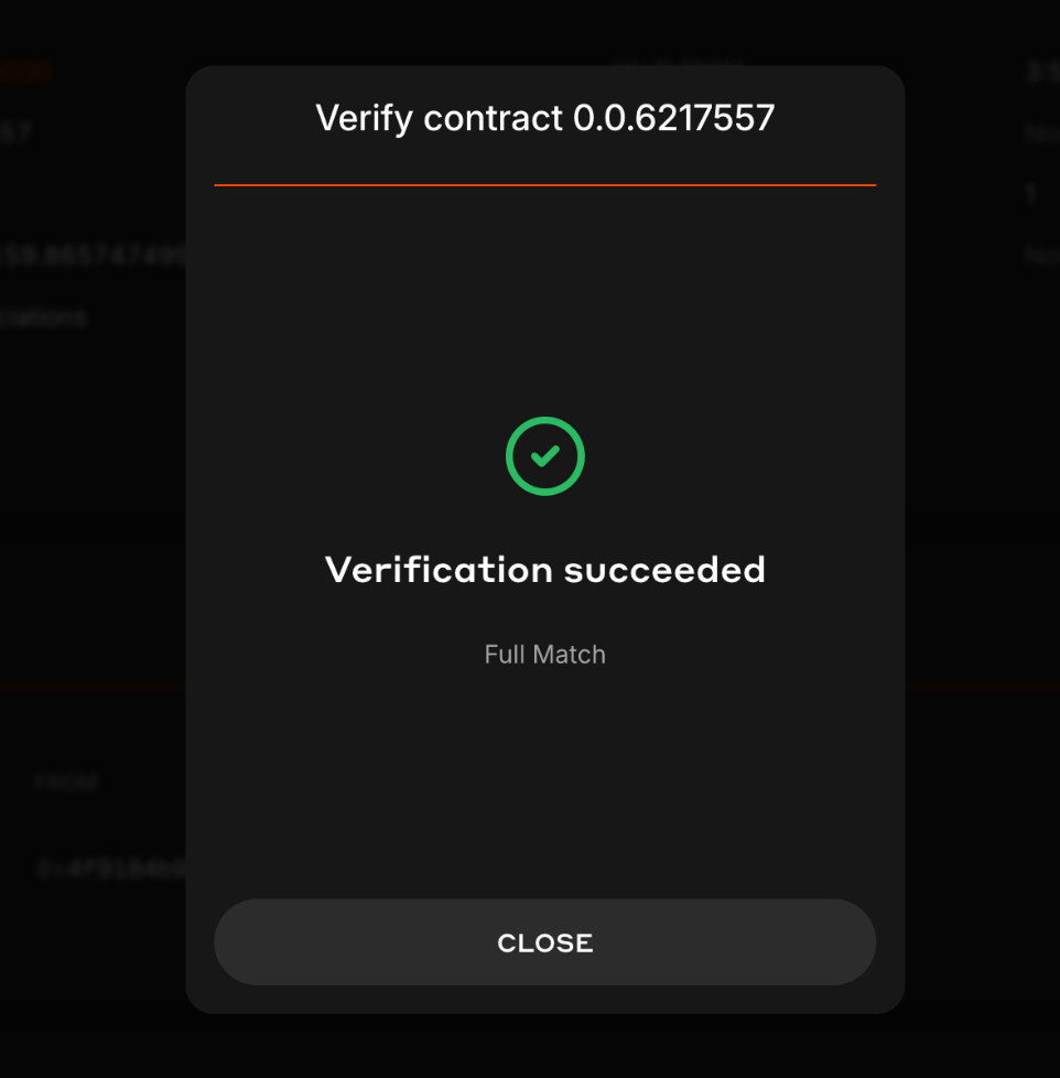 If your verification is successful, the verifier will return either a Full Match or Partial Match status. Let’s review each verification status and what they mean:- Full Match: Indicates the bytecode is a full (perfect) match, including all the metadata. The contract source code and metadata settings are identical to the deployed version.